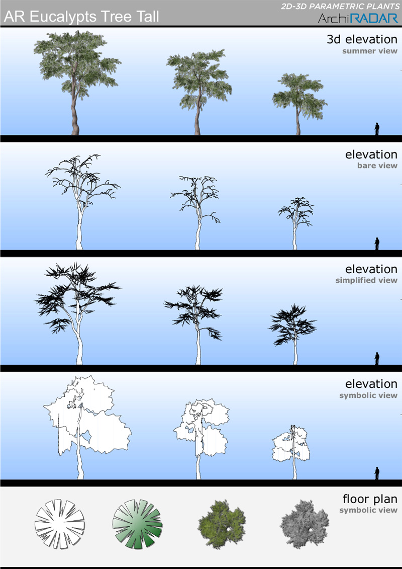 The objects are made with a low polygon quantity, they have a real growing factor according to the size and a corresponding symbolic view in elevation. Optimized for BIMX.