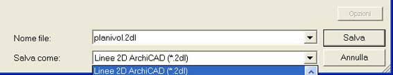 Ora lo salviamo nel formato "Linee 2D ArchiCAD (*.2dl)". Attenzione: questo formato è disponibile solo se la vista 3D è ottenuto con Motore interno, mentre non lo sarà se la vista è in formato OpenGL.