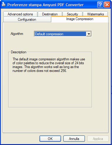 Come è possibile intuire possiamo impostare il grado di compressione delle immagini (e solo per esse, i contenuti vettoriali non vengono compressi) eventualmente presenti nella tavola. La compressione di default (se di compressione si può parlare) ha efficacia con immagini che non superino i 256 colori altrimenti non avrà effetto. L'altra opzione 256 color compression