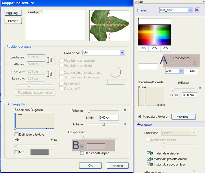 Non ci rimane che andare a selezionare il materiale Leaf_Adult e cliccare sul pulsante Modifica. Nella nuova finestra che si apre cliccate sul pulsante Aggiungi e selezionate la texture EFEU1 impostando i parametri come mostrato nella figura sottostante: