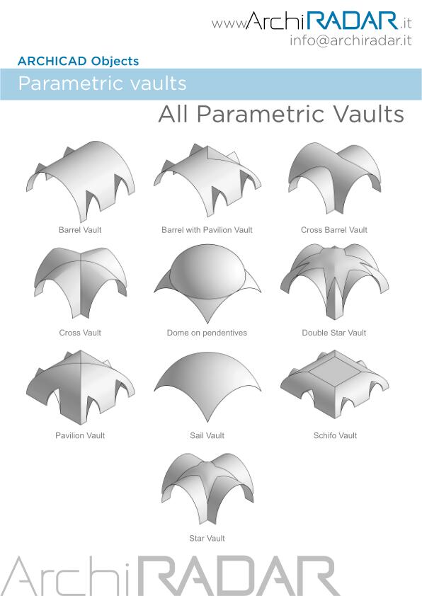 Gli oggetti Volte parametriche di ArchiRADAR (collezione completa) sono stati concepiti per velocizzare il lavoro del progettista, grazie alla possibilità di gestire molti parametri. I quattro punti della volta sono tutti editabili in forme libere anche autonomamente in altezza.